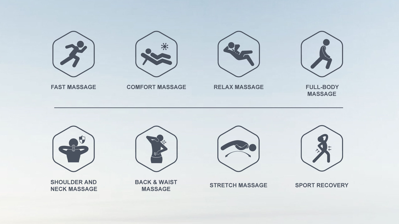 Περιλαμβάνει επίσης οκτώ αυτόματα προγράμματα και 5 διαφορετικά είδη μασάζ σε συνδυασμό με αερόσακους για τα άκρα, έτσι ώστε να αποτελεί την αποτελεσματικότερη λύση στο καθημερινό σας στρες και να σας βοηθά να βρίσκετε τον καλύτερο εαυτό σας σε κάθε μέρα!