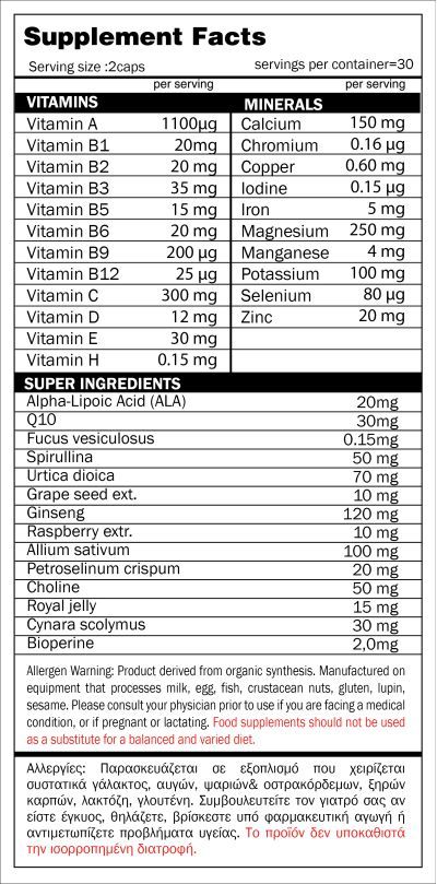 Θωρακίστε τον οργανισμό σας. 100% φυσικό σύμπλεγμα πολύ-βιταμινών. Ενισχύει τον οργανισμό σας μια καλή δόση ασβεστίου, σιδήρου, ψευδάργυρου, μαγνησίου, καλίου, ιωδίου και άλλων μετάλλων
