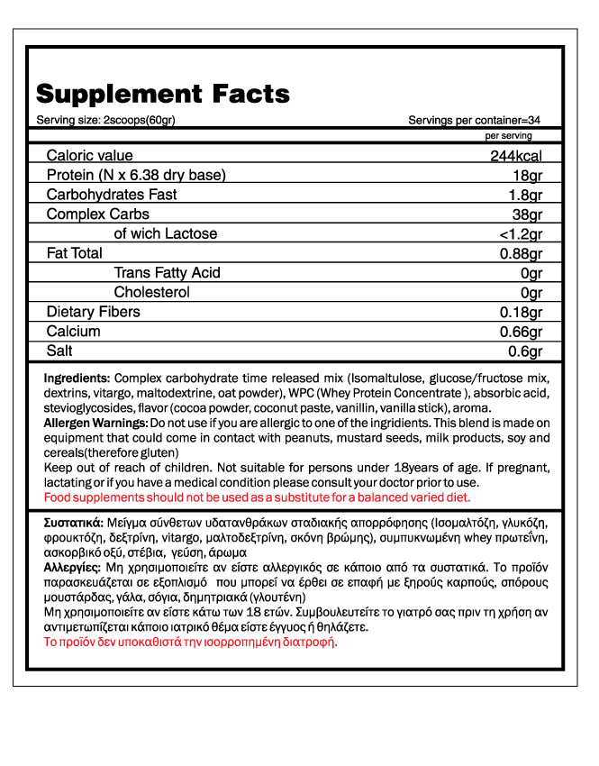 Aποτελείται από ένα σύμπλεγμα σύνθετων υδατανθράκων που απορροφώνται με διαφορετικούς ρυθμούς με αποτέλεσμα να απελευθερώνουν σταδιακά την ενέργεια που χρειάζεται το σώμα σας για να τροφοδοτήσει τις προπονήσεις σας, ενώ επίσης αναπληρώνει τα αποθέματα γλυκογόνου. Επιπλέον εξασφαλίζεται η διατήρηση της ινσουλίνης σε υψηλό επίπεδο, ενισχύοντας έτσι την αναβολική της δράση καθώς και πρωτεΐνη υψηλής διατροφικής αξίας και με λιγότερη ζάχαρη χοληστερίνη και σχεδόν μηδενικά κορεσμένα λιπαρά . Το MEGA MASS είναι το απόλυτο προϊόν για την αύξηση της μυϊκής σας μάζας!!!