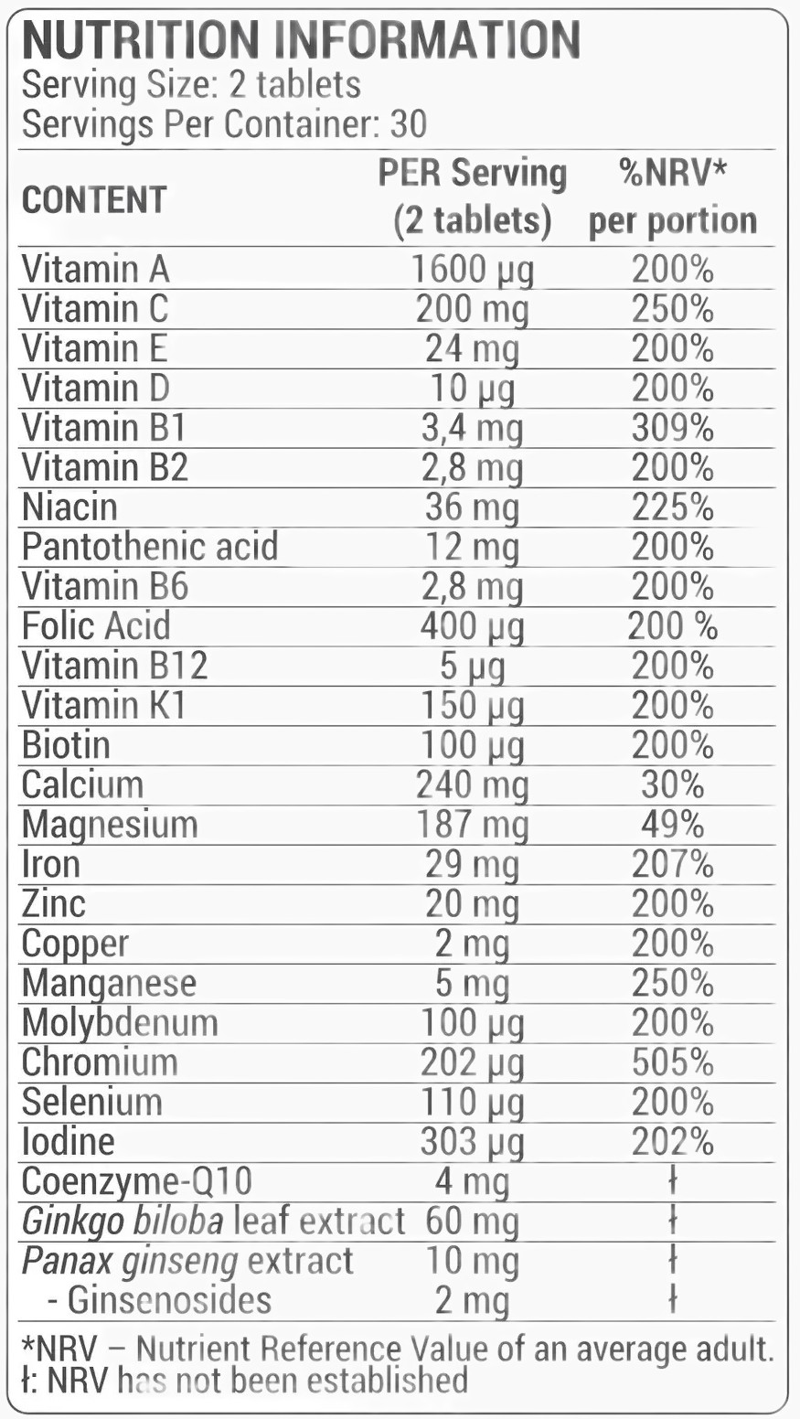 Κάθε μερίδα παρέχει τις 24 βασικές βιταμίνες και μέταλλα, συν 4mg συνένζυμο Q-10 και 220mg Panax Ginseng (προσαρμογόνα).