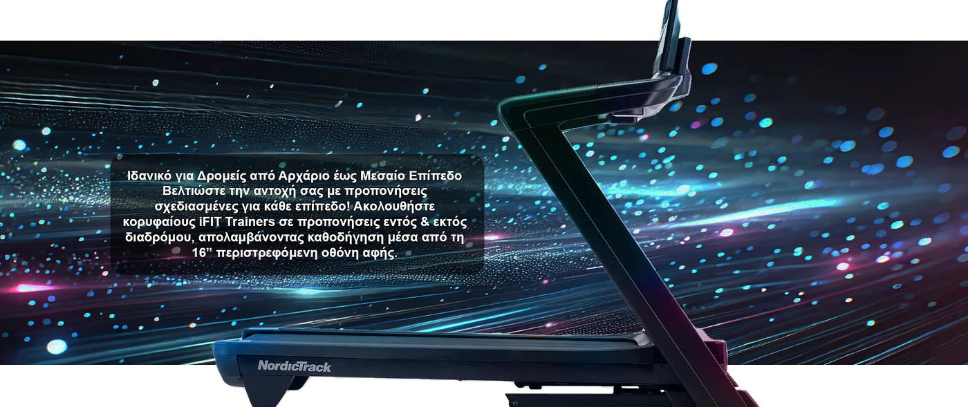 | Ηλεκτρονική κονσόλα | 16" Full Color Capacitive Touch Display (περιστρεφόμενη), iFIT® ENABLED: δυνατότητα σύνδεσης με το iFIT Coach, πρόγραμμα διαδραστικής προπόνησης, Ήχος: Premium Audio / Bluetooth Headphone Compatible |