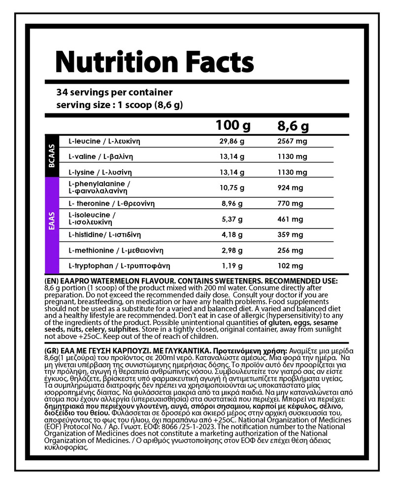 Λαμβάνετε 1 μεζούρα EAA Pro Watermelon (8,6 g) καθημερινά. Λάβετε το συμπλήρωμα EAA Pro Watermelon 300g πριν, κατά τη διάρκεια ή μετά την προπόνησή σας. Τις ημέρες που δεν έχετε προπόνηση, λάβετε το EAA Pro Watermelon 300g οποιαδήποτε στιγμή της ημέρας.