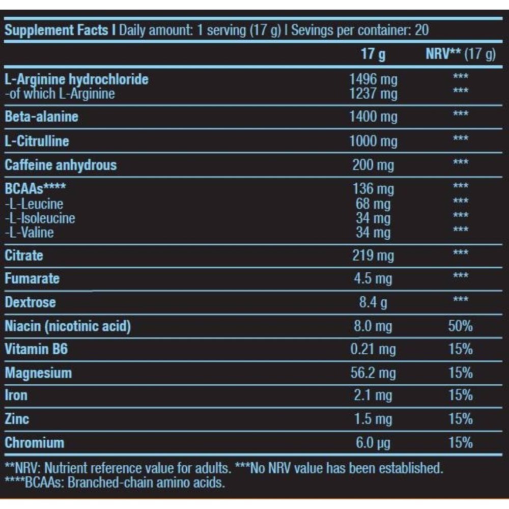 Αναμείξτε 1 μερίδα (17 g = 1 μεζούρα = 1 γεμάτη κουταλιά της σούπας) προϊόν με 250 ml νερό σε ένα μπουκάλι shaker. Πάρτε 1 μερίδα 30 λεπτά πριν την προπόνησή σας. Μην υπερβαίνετε τη συνιστώμενη δόση!
