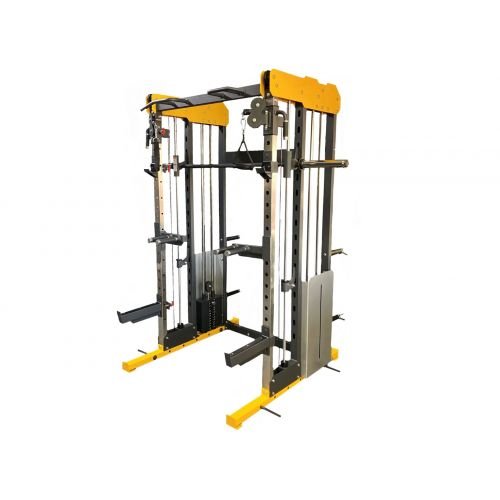 | Λοιπά χαρακτηριστικά | Κλωβός δύναμης, μηχανή smith , το οποίο υποστηρίζει την ανύψωση μεγάλων φορτίων και την εκτέλεση ασκήσεων squats , πιέσεων στήθους σε πάγκο κ.α., crossover διπλού μηχανισμού με περιστρεφόμενες ρυθμιζόμενες τροχαλίες 22 θέσεων, μονόζυγο πολλαπλών λαβών για έλξεις ανοικτών ή κλειστών λαβών με δυνατότητα προσαρμογής και συστήματος εξάσκησης με ιμάντες. 2 λαβές βυθίσεων , ρυθμιζόμενες καθ'ύψος σε 22 θέσεις και επικάλυψη λάστιχου. 2 θέσεις μπάρας , για εξάσκηση με ελεύθερα βάρη , ρυθμιζόμενες καθ'ύψος .διαθέτουν υποδοχείς ασφαλείας για την μπάρα και επικάλυψη λάστιχου. ενσωματωμένα βάρη , χωρισμένα σε 2 σειρές ατσάλινων πλακών , οι οποίες συνδέονται μέσω συρματόσχοινων . |