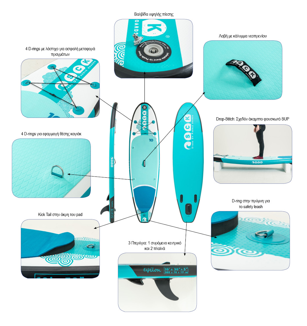 Λοιπά χαρακτηριστικά Πτερύγια: 1 συρόμενο κεντρικό 9inch και 2 πλαϊνά. Λάστιχο στην πλώρη, για μεταφορά διάφορων αντικειμένων. 4 D-rings προεξέχουν από το soft pad περιμετρικά της λαβής και χρησιμεύουν για εφαρμογή καθίσματος καγιάκ.. D-ring στην πρύμνη για το leash. Βαλβίδα υψηλής πίεσης στην πλώρη. Λαβή μεταφοράς στο κέντρο της σανίδας, ενισχυμένη με ύφασμα νεοπρέν. Kick Tail στην πρύμνη