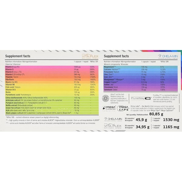 Το Vita-Min Multiple Sport® είναι ένας περίπλοκος συνδυασμός βιταμινών που περιέχει μεταξύ άλλων την πρωτοποριακή βιταμίνη C της νέας γενιάς PureWay-C® μαζί με ένα σύνολο ειδικών εκχυλισμάτων που υποστηρίζουν τη σωστή λειτουργία του ήπατος και του προστάτη. Η δεύτερη κάψουλα (Chela-Min Sport®), περιέχει εξαιρετικά αφομοιώσιμα, υψηλής ποιότητας μέταλλα με τη μορφή χηλικών αμινοξέων από το ALBION®. Και τα δύο σύμπλοκα Vita-Plex Sport® και Chela-min Sport® διευκολύνουν την εκπλήρωση της βασικής ζήτησης για τις απαραίτητες θρεπτικές μικροσυστατικές ουσίες για ένα σώμα που επιβαρύνεται από έντονη φυσική άσκηση. Η επιστημονική έρευνα έχει αποδείξει ότι η συστηματική συμπλήρωση της διατροφής ενός αθλητή με βιταμίνες και μέταλλα ενισχύει την ικανότητα άσκησης. H βιοφλαβονοειδή εσπεριδοειδών εξαλείφει τις ελεύθερες ρίζες ενισχύοντας έτσι την αντιοξειδωτική δράση της βιταμίνης c. To πολυφαινόλες πράσινου τσαγιού (συμπεριλαμβανομένου του EGCG) , που έχουν αντιοξειδωτικές ιδιότητες,  έχουν θετική επίδραση στον μεταβολισμό και την καύση λίπους. H κυναρίνη από την αγκινάρα έχει θετική επίδραση στις λειτουργίες του ήπατος, γεγονός που επιτρέπει την αποτελεσματική χρήση των δομικών και ενεργειακών ουσιών στα τρόφιμα. To πολυφαινόλες και φυτοστερόλες από κολοκύθα και τσουκνίδες έχει θετική επίδραση στη λειτουργία του ορμονικού συστήματος μαζί με την προσαρμογή του σώματος στη σωματική άσκηση. To αλφα-λινολενικό οξύ (ALA) έχει θετική επίδραση στις λειτουργίες του ήπατος, είναι σημαντικό για την απορρόφηση ενεργών ουσιών στον μυϊκό ιστό και για το μεταβολισμό που απελευθερώνει χρήσιμη ενέργεια. Η πιπερίνη (Bioperine®) από μαύρο πιπέρι  έχει θετική επίδραση στην απορρόφηση, στο πεπτικό σύστημα, όλων των θρεπτικών ουσιών, συμπεριλαμβανομένων των δραστικών ουσιών που περιέχονται στο παρασκεύασμα.