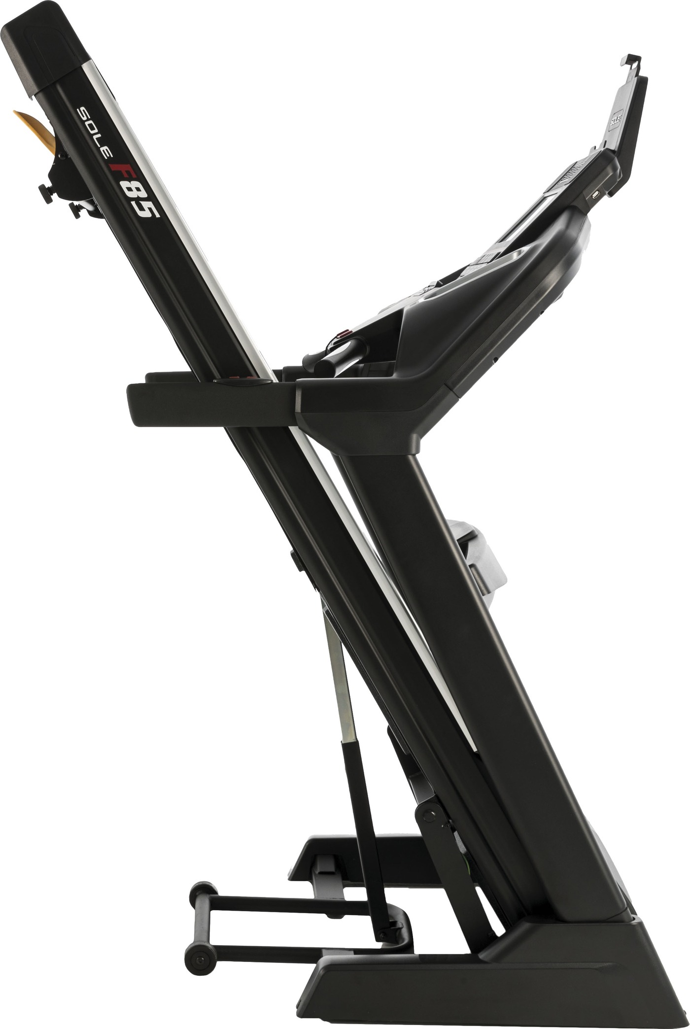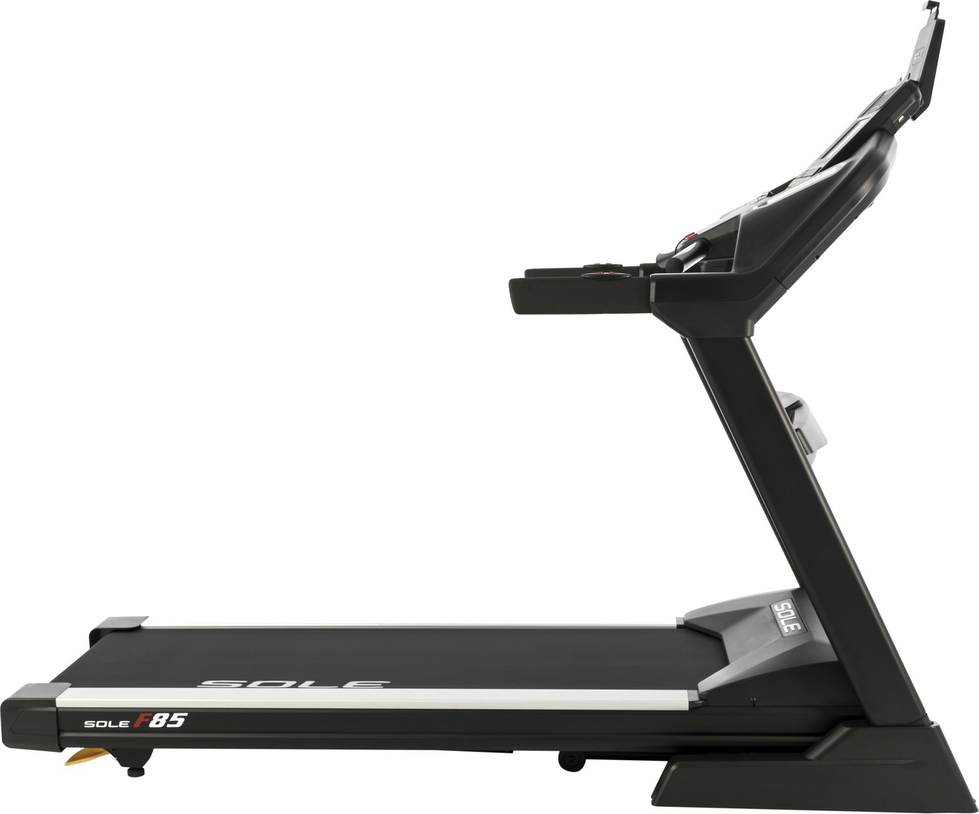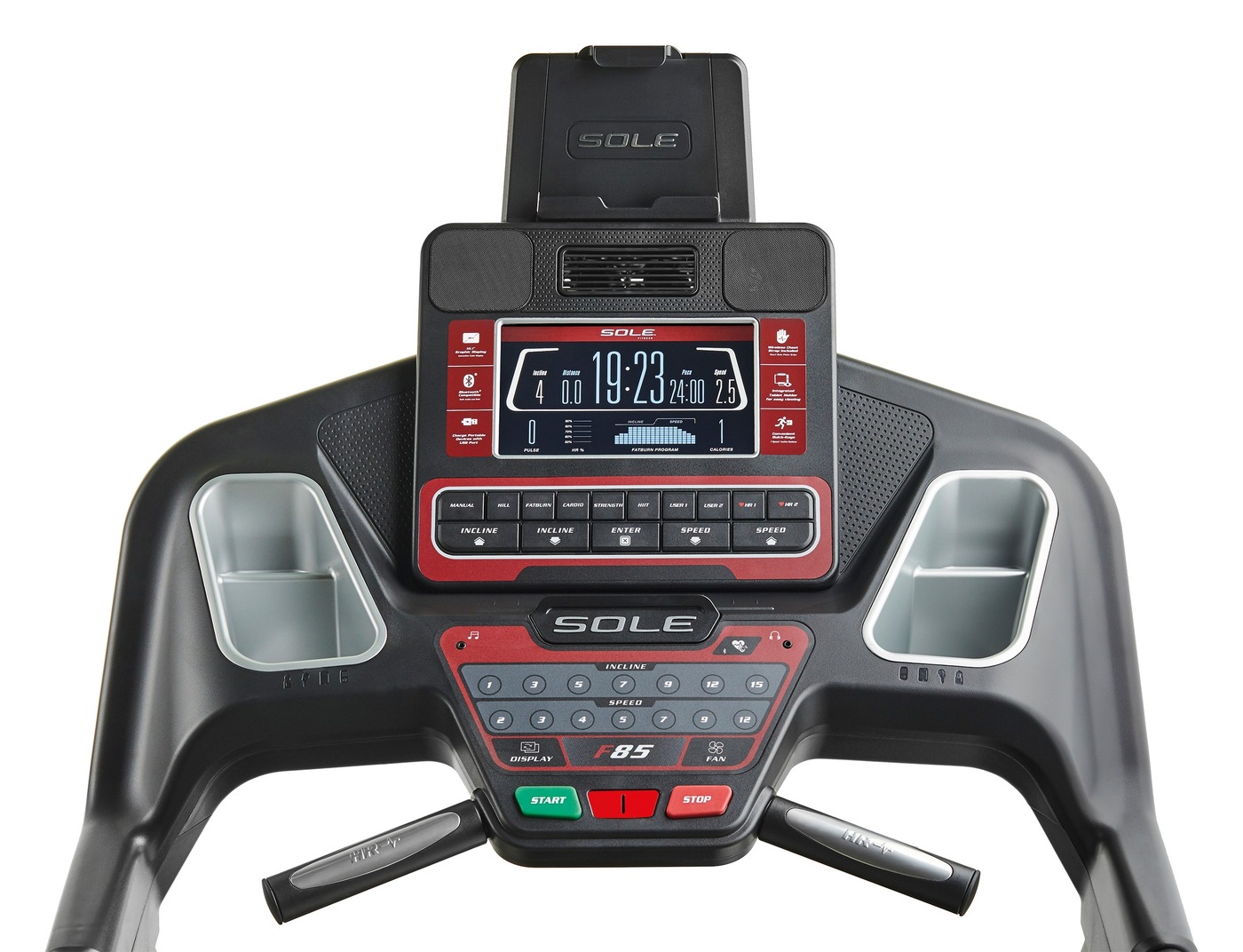 Ο Sole F85 αποτελεί τον καλύτερο αναδιπλούμενο διάδρομο της εταιρίας και έναν από τους καλύτερους οικιακούς διαδρόμους στον κόσμο. Διαθέτει LCD οθόνη 10,1" η οποία προβάλει τις απαραίτητες ενδείξεις, και ειδική θήκη για το κινητό/tablet σας. Επίσης κατά την διάρκεια της άσκησεις έχει USB για να φορτίζετε την συσκευή σας, την οποία μπορείτε να συνδέσετε μέσω Bluetooth ή καλωδίου Jack (3,5mm) για παίξετε μουσική από τα ενσωματωμένα ηχεία. Εξοπλισμένος με ένα πανίσχυρο μοτέρ 4HP, άνετο δάπεδο τρεξίματος, και ηλεκτρική κλίση μέχρι 15%, εχει χειριστήρια ταχύτητας και κλίσης στις χειρολαβές για άνετες εναλλαγές. Τέλος συνδέεται με εφαρμογές όπως Kinomap για Interactive διαδρομές.