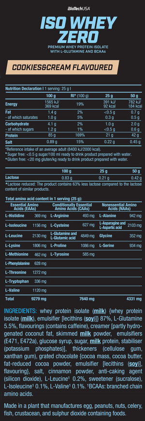 Η Iso Whey ZERO παρασκευάζεται με την πιο αγνή δυνατή απομονωμένη πρωτεΐνη ορού γάλακτος με επεξεργασία μικροδιήθησης, ενώ ταυτόχρονα περιέχει μόνο 0,2 g λακτόζης, 0,3 g κορεσμένων λιπαρών και 0,5 g ζάχαρης ανά δόση. Η Iso Whey ZERO, όπως όλα τα προϊόντα της BioTech USA, περιέχει ασφαλή, προσεκτικά επιλεγμένα θρεπτικά συστατικά.