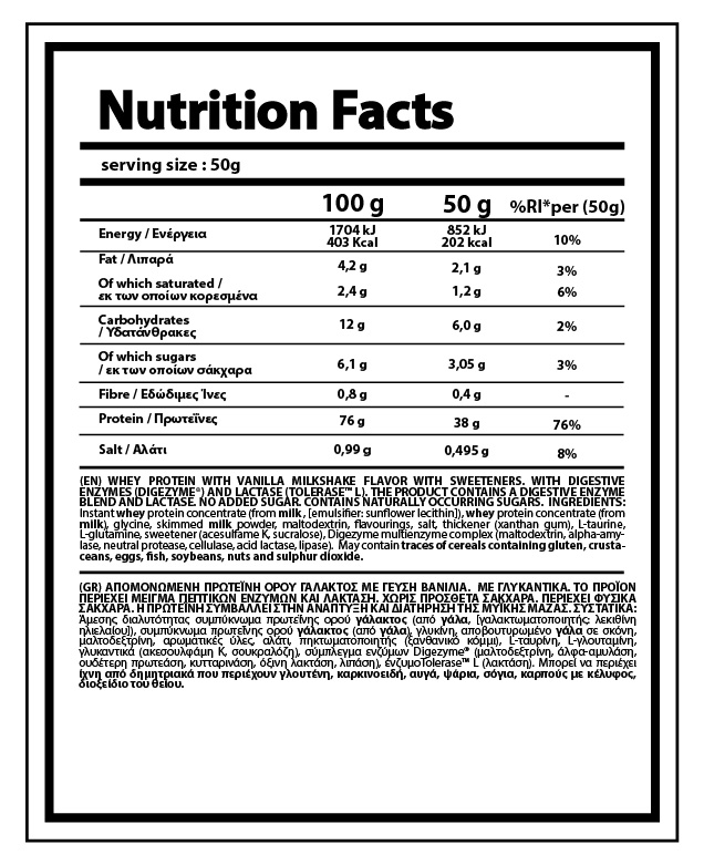 Η προσθήκη πεπτικών ενζύμων “DigeZyme®” και λακτάσης διευκολύνει την απορρόφηση και μειώνει την πιθανότητα δυσανεξίας, καθιστώντας το κατάλληλο ακόμη και για άτομα με ευαισθησία στη λακτόζη. Με GMP πιστοποίηση, χωρίς ΓΤΟ, χωρίς φοινικέλαιο και χωρίς προσθήκη ζάχαρης, αποτελεί αγνή και αξιόπιστη επιλογή για κάθε αθλητή ή δραστήριο άτομο.