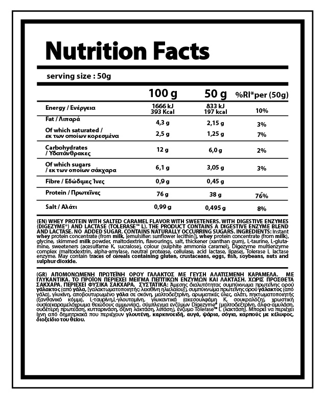 Η προσθήκη πεπτικών ενζύμων “DigeZyme®” Eκαι λακτάσης διευκολύνει την απορρόφηση και μειώνει την πιθανότητα δυσανεξίας, καθιστώντας το κατάλληλο ακόμη και για άτομα με ευαισθησία στη λακτόζη. Με GMP πιστοποίηση, χωρίς ΓΤΟ, χωρίς φοινικέλαιο και χωρίς προσθήκη ζάχαρης, αποτελεί αγνή και αξιόπιστη επιλογή για κάθε αθλητή ή δραστήριο άτομο.