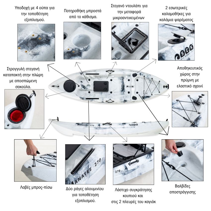 | Εξοπλισμός | - Ένα στεγανό ντουλάπι, παραλληλόγραμμο στο σχήμα, με επαρκές βύθισμα για την μεταφορά μικροαντικειμένων με ασφάλεια. - Μία στρογγυλή στεγανή καταπακτή στην πλώρη με αποσπώμενη σακούλα, δίνει πρόσβαση στο εσωτερικό του καγιάκ και έχει διάμετρο 28 εκατοστά. - Ένας άνετος χώρος με λάστιχο συγκράτησης στο πίσω μέρος του καγιάκ, είναι ιδανικός για μεταφορά μεγαλύτερων πραγμάτων. - 2 εσωτερικές καλαμοθήκες για καλάμια ψαρέματος καθώς και η υποδοχή με 4 ούπα ανάμεσα από τα πόδια για την τοποθέτηση εξωτερικής καλαμοθήκης ή άλλου εξοπλισμού. - Μία ποτηροθήκη μπροστά από το κάθισμα. - Δύο ράγες αλουμινίου για τοποθέτηση εξοπλισμού. - Πλαϊνές λαβές με λάστιχο συγκράτησης κουπιού. - Σχαριέρα στην γάστρα και τρύπα στο κατάστρωμα, χρήσιμο για προσαρμογή βυθόμετρου. - Λαβές μπρος-πίσω. - Leash σπιράλ για κουπί. |