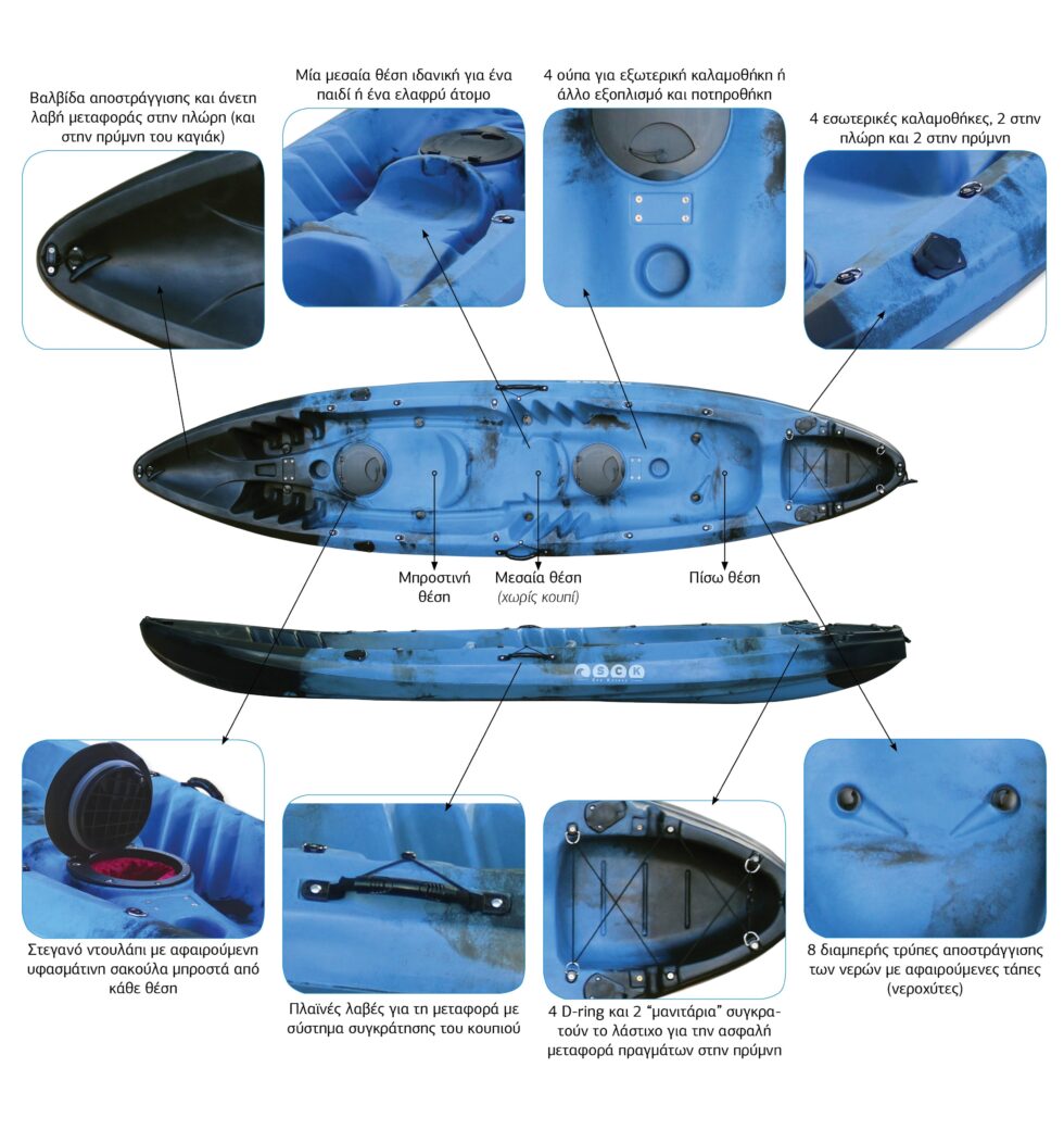 Το συγκεκριμένο καγιάκ είναι σχεδιασμένο για 2 ενήλικες και ένα παιδί, μπορεί όμως να μεταφέρει με άνεση 250 κιλά που αμέσως το καθιστά ένα τριθέσιο καγιάκ.