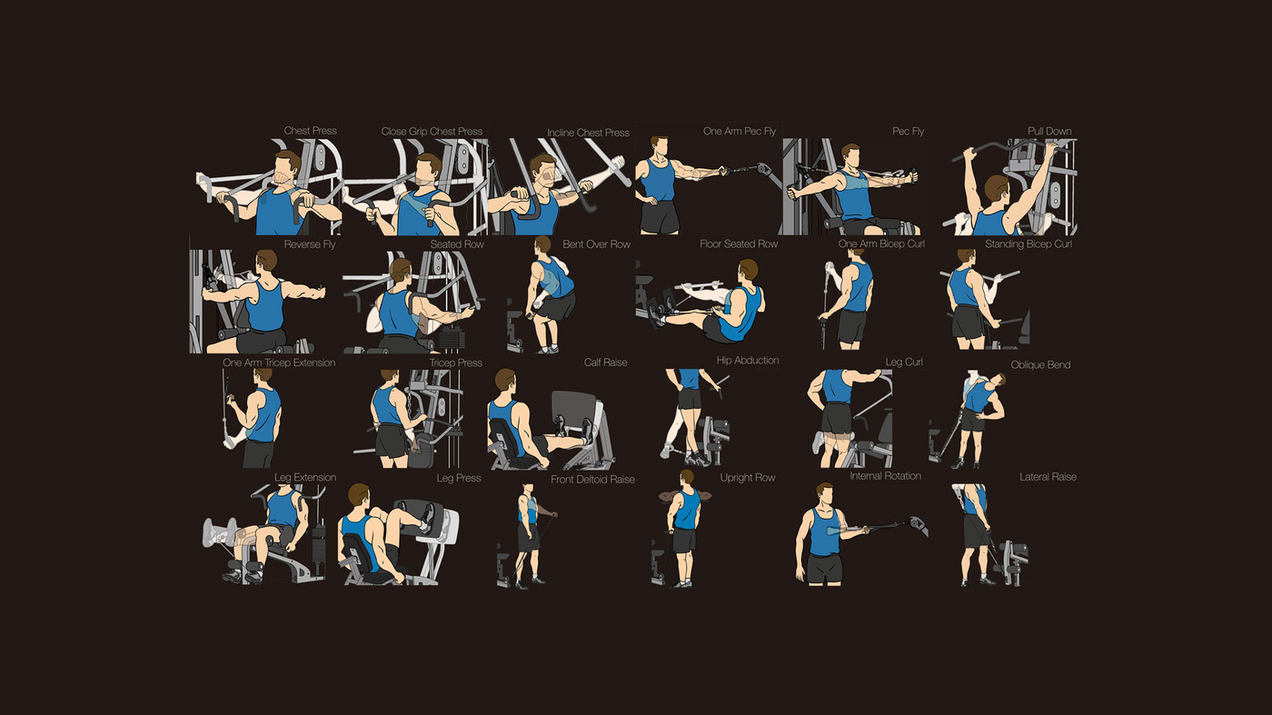 | Ασκήσεις | Πιέσεις στήθους, Επικλινείς πιέσεις στήθους, Εκτάσεις στήθους, Τροχαλία πλάτης, Καθιστή κωπηλατική, Χαμηλή κωπηλατική, Καθιστές πιέσεις ώμων, Όρθιες πιέσεις ώμων, Πλάγιες εκτάσεις ώμων, Εκτάσεις ποδιών, Όρθιες κάμψεις ποδιών, Πιέσεις τρικεφάλων, Εκτάσεις τρικεφάλων, Κάμψεις δικεφάλων, … και πολλές άλλες! |