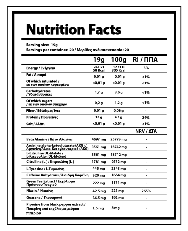 ✔ Συνδυασμός Επιστημονικά Βασισμένων Συστατικών – Η βελτιστοποιημένη αναλογία Citrulline (5342 mg), Beta-Alanine (4907 mg) και AKG (3569 mg) εξασφαλίζει αύξηση της αντοχής, της αιμάτωσης και της ενεργειακής παραγωγής σε ένα προϊόν. ✔ Διαφορετικό Ενεργειακό Πρόφιλ – Η "έξυπνη" μίξη καφεΐνης (320 mg), guarana (36 mg) και green tea extract (223 mg) παρέχει ισχυρή διέγερση χωρίς νευρικότητα, με ομαλή αποδέσμευση ενέργειας. ✔ Διπλή Δράση για Σώμα & Μυαλό – Εκτός από ενέργεια, περιέχει L-Tyrosine (446 mg) που αντισταθμίζει την ψυχολογική πίεση της καφεΐνης, διατηρώντας τη συγκέντρωση αιχμής.