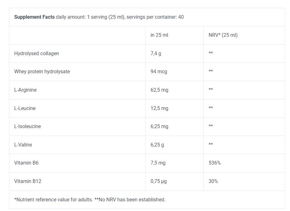 Μια μόνη δόση από το Liquid Amino απελευθερώνει 12 γραμμάρια από καθαρά αμινοξέα, προερχόμενα από υδρολυμένο κολλαγόνο και υδρολυμένη πρωτεΐνη ορού γάλακτος. Όπως όλα τα προϊόντα της BioTechUSA, το Liquid Amino περιέχει ασφαλή και προσεκτικά επιλεγμένα θρεπτικά συστατικά.
