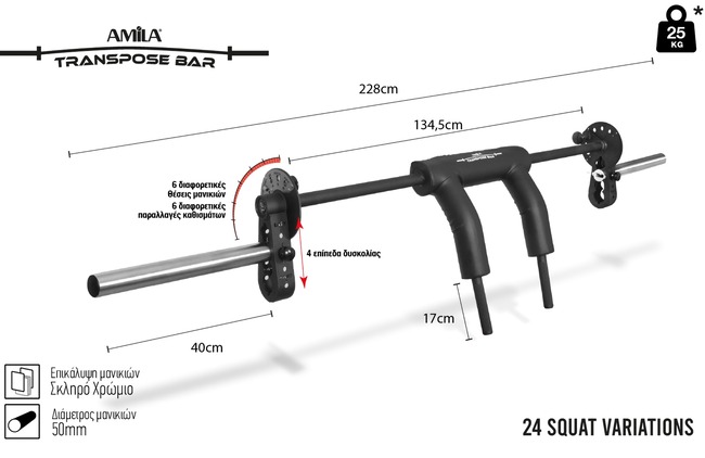 Η μπάρα AMILA Transpose Bar είναι μια μοναδική, ρυθμιζόμενη μπάρα καθισμάτων (safe squat bar) η οποία επιτρέπει τους αθλητές όλων των επιπέδων να πραγματοποιήσουν διάφορα είδη καθισμάτων με μεγάλη αποτελεσματικότητα και ασφάλεια. Με τον μηχανισμό με τον πείρο που έχει μπορείτε να ρυθμίσετε την κλίση των βαρών πραγματοποιώντας 6 διαφορετικές κινήσεις καθισμάτων.